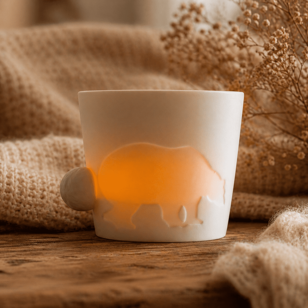 Ein praktischer Zusatz: Der Kinto Mugtail Bär eignet sich auch als Windlicht. Mit einem Teelicht im Inneren leuchtet die geprägte Silhouette sanft auf und bringt eine warme Stimmung auf Tisch, Fensterbank oder Regal.